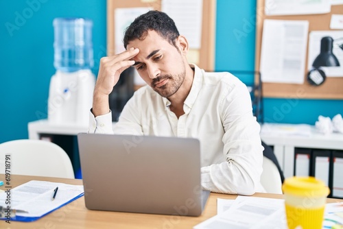 Young hispanic man business worker stressed using laptop at office