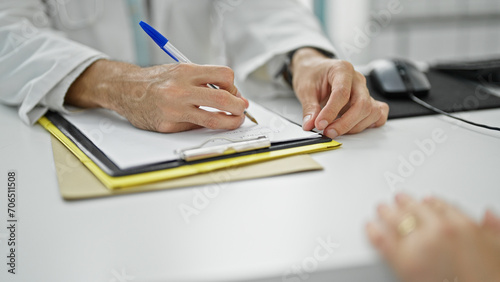 Young hispanic man doctor having medical consultation taking notes at the clinic