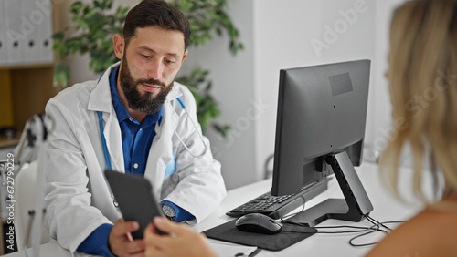 Young hispanic man doctor showing touchpad to patient at the clinic