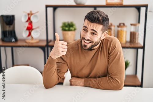 Young hispanic man doing ok sign with thumb up sitting on table at home