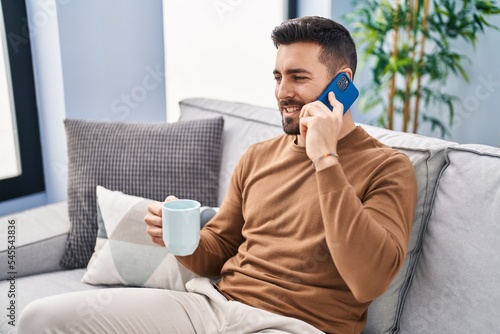 Young hispanic man drinking coffee and talking on the smartphone at home