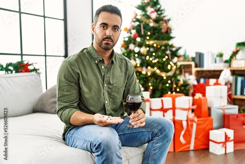 Young hispanic man holding glass of wine and pills sitting on sofa with dog by christmas tree at home