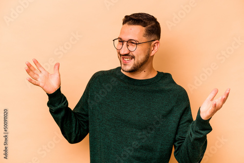 Young hispanic man isolated on beige background joyful laughing a lot. Happiness concept.