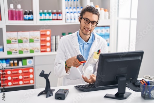 Young hispanic man pharmacist scanning pills bottle at pharmacy