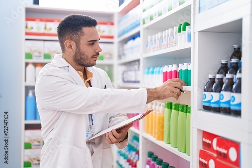 Young hispanic man pharmacist writing on document with serious expression at pharmacy