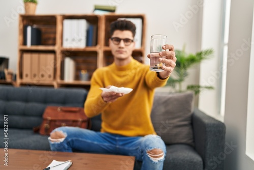 Young hispanic man psychologist counseling offer water and napkin at psychology center
