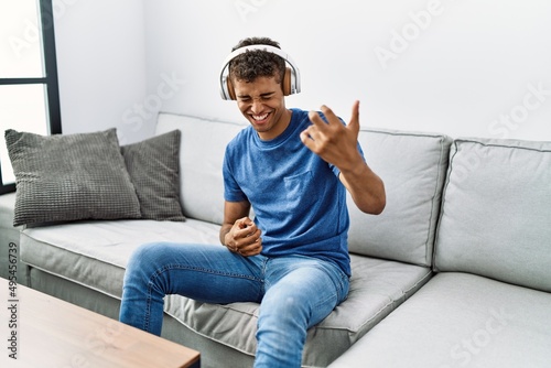 Young hispanic man relaxing sitting on the sofa wearing headphones at home