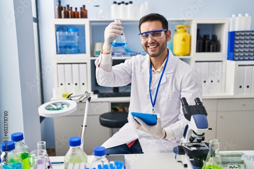 Young hispanic man scientist measuring liquid using touchpad at laboratory