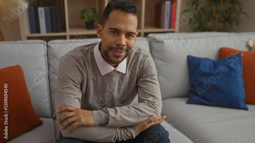 Young hispanic man sitting in a cozy living room with stylish decor, exuding confidence and friendliness, surrounded by colorful pillows and bookshelves indoors.