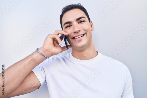 Young hispanic man smiling confident talking on the smartphone over isolated white background