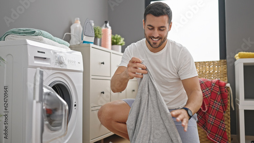 Young hispanic man smiling confident washing clothes at laundry room