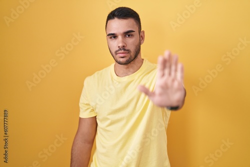 Young hispanic man standing over yellow background doing stop sing with palm of the hand. warning expression with negative and serious gesture on the face.