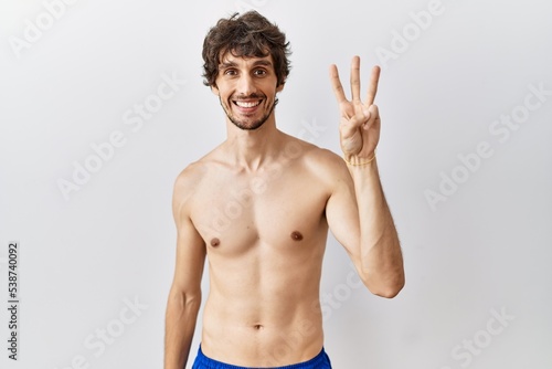 Young hispanic man standing shirtless over isolated, background showing and pointing up with fingers number three while smiling confident and happy.