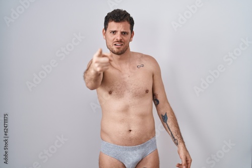 Young hispanic man standing shirtless wearing underware pointing displeased and frustrated to the camera, angry and furious with you