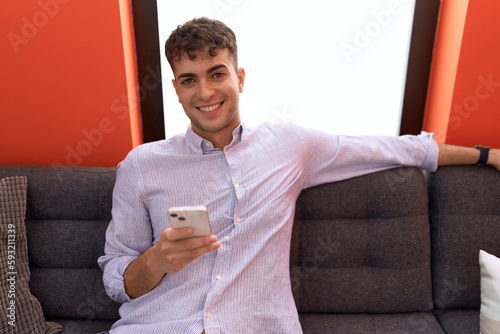 Young hispanic man using smartphone sitting on sofa at home