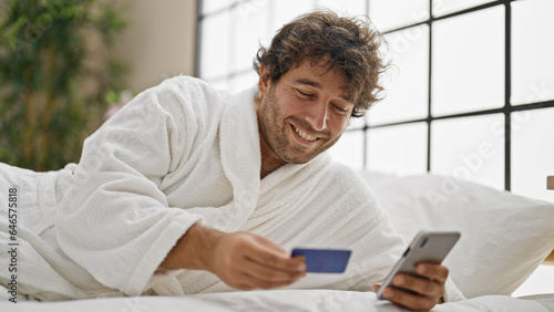 Young hispanic man wearing bathrobe shopping with smartphone and credit card at bedroom