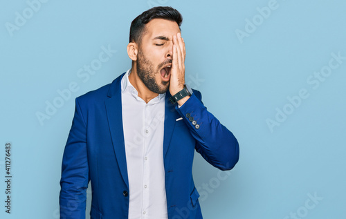 Young hispanic man wearing business jacket yawning tired covering half face, eye and mouth with hand. face hurts in pain.