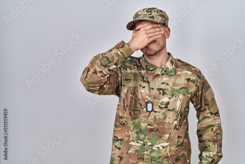 Young hispanic man wearing camouflage army uniform smiling and laughing with hand on face covering eyes for surprise. blind concept.