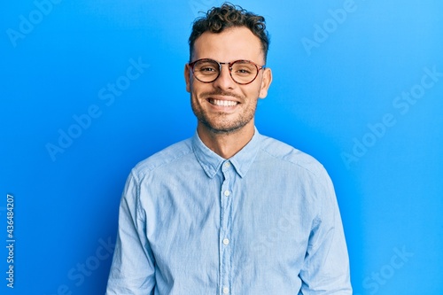 Young hispanic man wearing casual clothes and glasses with a happy and cool smile on face. lucky person.