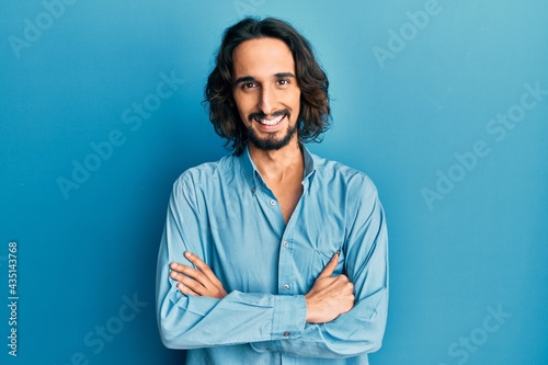 Young hispanic man wearing casual clothes happy face smiling with crossed arms looking at the camera. positive person.