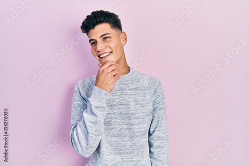 Young hispanic man wearing casual clothes with hand on chin thinking about question, pensive expression. smiling with thoughtful face. doubt concept.
