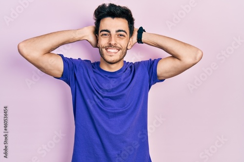Young hispanic man wearing casual t shirt relaxing and stretching, arms and hands behind head and neck smiling happy