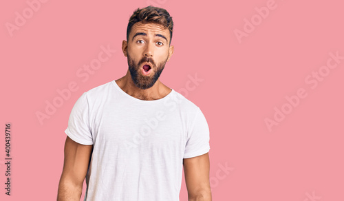 Young hispanic man wearing casual white tshirt afraid and shocked with surprise expression, fear and excited face.