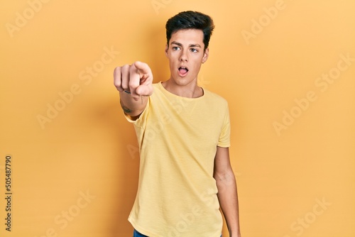Young hispanic man wearing casual yellow t shirt pointing with finger surprised ahead, open mouth amazed expression, something on the front
