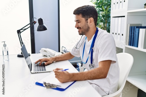 Young hispanic man wearing doctor uniform writing on document working at clinic