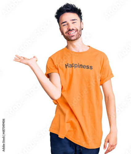 Young hispanic man wearing t shirt with happiness word message smiling cheerful presenting and pointing with palm of hand looking at the camera.