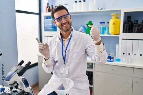 Young hispanic man with beard working at scientist laboratory holding green ribbon smiling happy pointing with hand and finger to the side