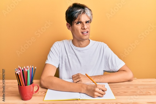 Young hispanic man writing book sitting on the table clueless and confused expression. doubt concept.