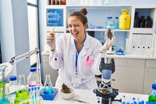 Young hispanic woman doing weed oil extraction at laboratory winking looking at the camera with sexy expression, cheerful and happy face.