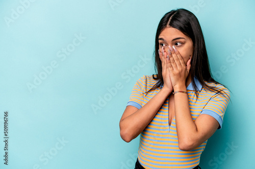 Young hispanic woman isolated on blue background thoughtful looking to a copy space covering mouth with hand.
