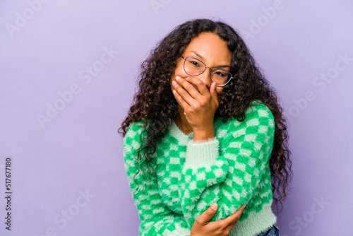 Young hispanic woman isolated on purple background laughing happy, carefree, natural emotion.
