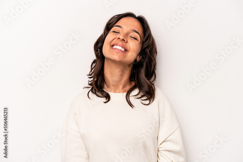 Young hispanic woman isolated on white background relaxed and happy laughing, neck stretched showing teeth.