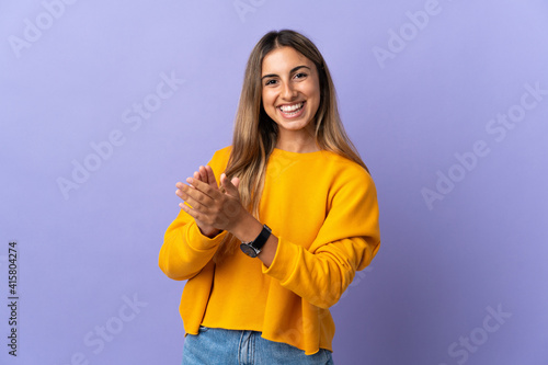 Young hispanic woman over isolated purple background applauding after presentation in a conference