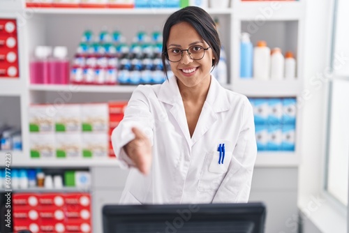 Young hispanic woman pharmacist smiling confident shake hand at pharmacy