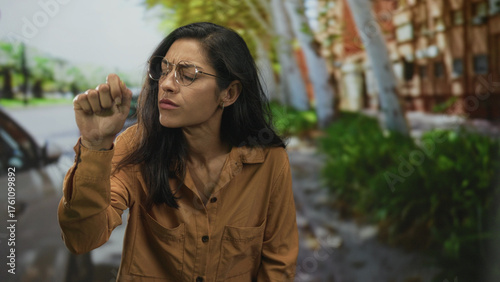 Young hispanic woman shrugs shoulders with palms up on a city street beside parked cars and sidewalk greenery; confusion questioning.