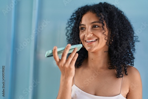 Young hispanic woman smiling confident talking on the smartphone over blue background