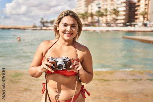 Young hispanic woman wearing bikini using vintage camera at seaside