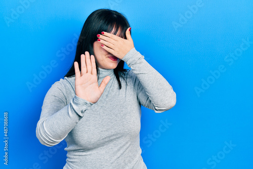 Young hispanic woman wearing casual clothes covering eyes with hands and doing stop gesture with sad and fear expression. embarrassed and negative concept.