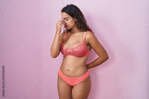 Young hispanic woman wearing lingerie over pink background tired rubbing nose and eyes feeling fatigue and headache. stress and frustration concept.
