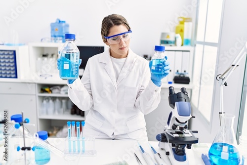 Young hispanic woman wearing scientist uniform holding liquid bottle at laboratory