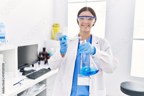 Young hispanic woman wearing scientist uniform holding test tube at laboratory