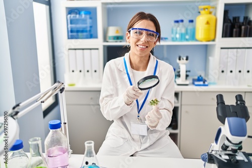 Young hispanic woman wearing scientist uniform using magnifying glass at laboratory