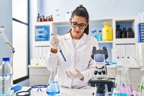 Young hispanic woman wearing scientist uniform using pipette working at laboratory