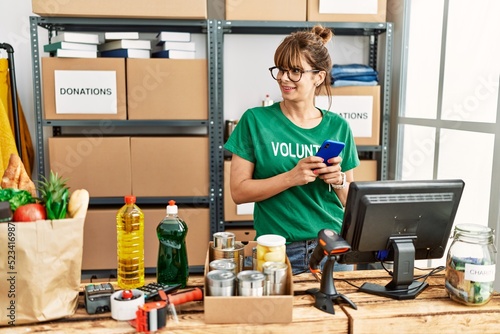 Young hispanic woman wearing volunteer uniform using smartphone at charity center