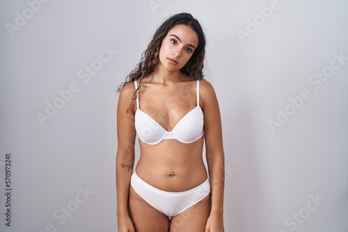 Young hispanic woman wearing white lingerie looking sleepy and tired, exhausted for fatigue and hangover, lazy eyes in the morning.