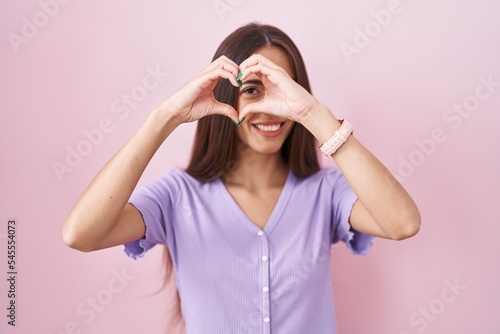Young hispanic woman with long hair standing over pink background doing heart shape with hand and fingers smiling looking through sign